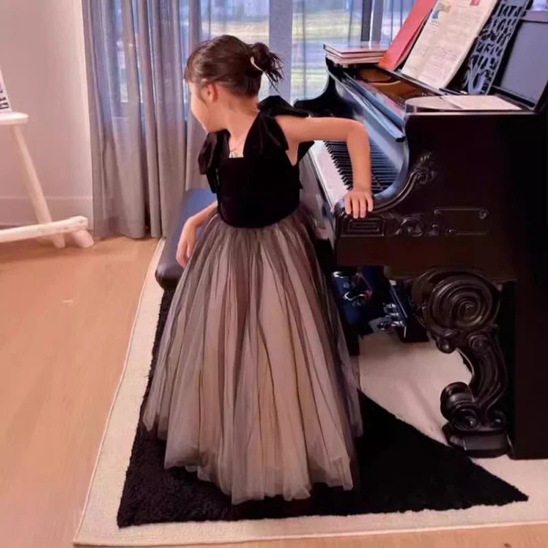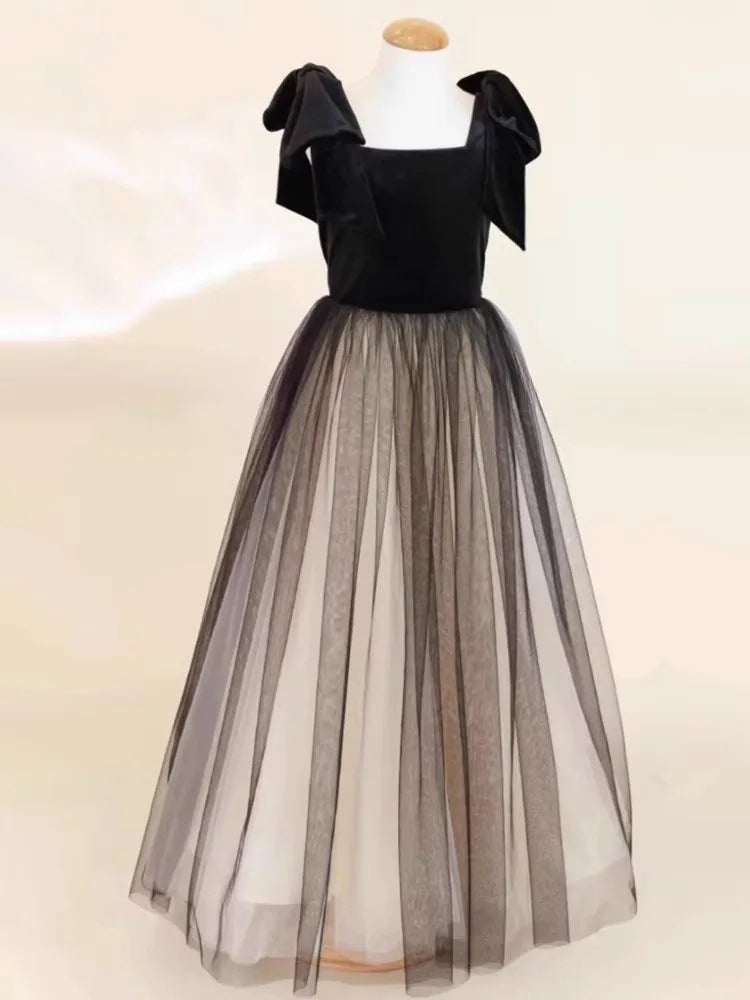 Girls Black Velvet High-end Mesh Princess Dress